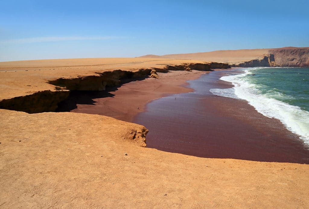 Playa Roja est une des plages les plus uniques du Pérou, célèbre pour son sable rougeâtre, un contraste saisissant avec le bleu profond de l'océan. Située dans la Réserve Nationale de Paracas, cette plage offre non seulement une beauté naturelle exceptionnelle mais aussi la possibilité d'explorer la biodiversité marine et terrestre de la région.
