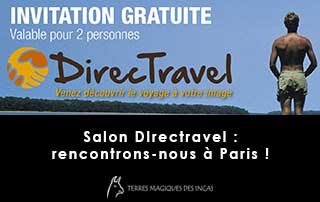 Nous serons présents sur le salon DirecTravel qui se déroulera du 30 septembre au 2 octobre à PARIS. C’est l’occasion parfaite pour se revoir ou se rencontrer et échanger ensemble autour du Pérou ! Nous vous avons réservé des invitations gratuites valables pour 2 personnes, alors n’hésitez pas à venir nous voir et passer quelques minutes avec notre équipe.